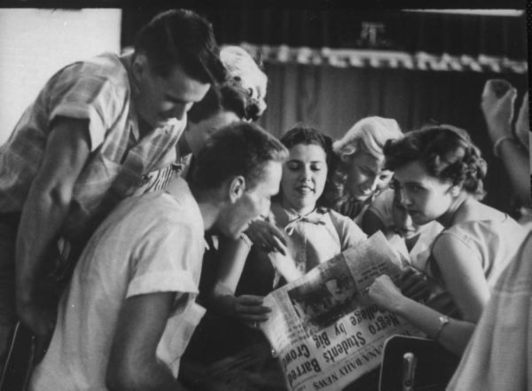 White students reading about the Texarkana College riot, photographer Joe Scherschel, 1956
